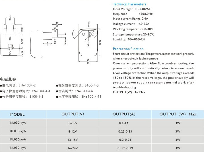 頻率:50/60Hz 輸入電流:0.4A 漏電電流:≤0.25A 工作溫度:0-40℃ 貯藏溫度:-20-80℃ 濕度:10%-80%RH 短路保護(hù): 電源適配器在短路解除時(shí)能正常工作恢復(fù) 過流保護(hù):過流故障排除后,電源將自動恢復(fù)正常工作 過壓保護(hù):當(dāng)輸出電壓超過額定電壓的150-180%時(shí),電源將保護(hù),故障排除后電源能恢復(fù)正常工作" />